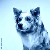 A Border Collie is captured in a close-up portrait with a serious expression, framed by its fluffy fur and piercing eyes.