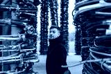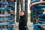 Man in black hoodie standing between towering stacks of colorful industrial cables outdoors, soft natural light, shallow depth of field, thoughtful calm expression
