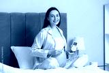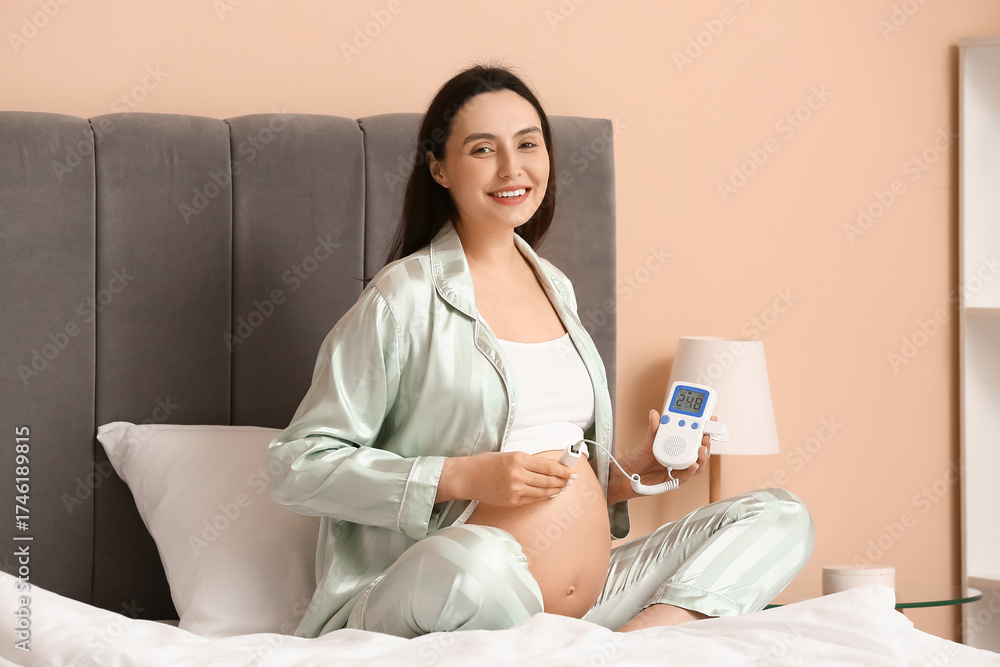 Young pregnant woman with fetal doppler listening to baby's heartbeat on bed at home