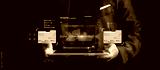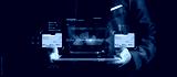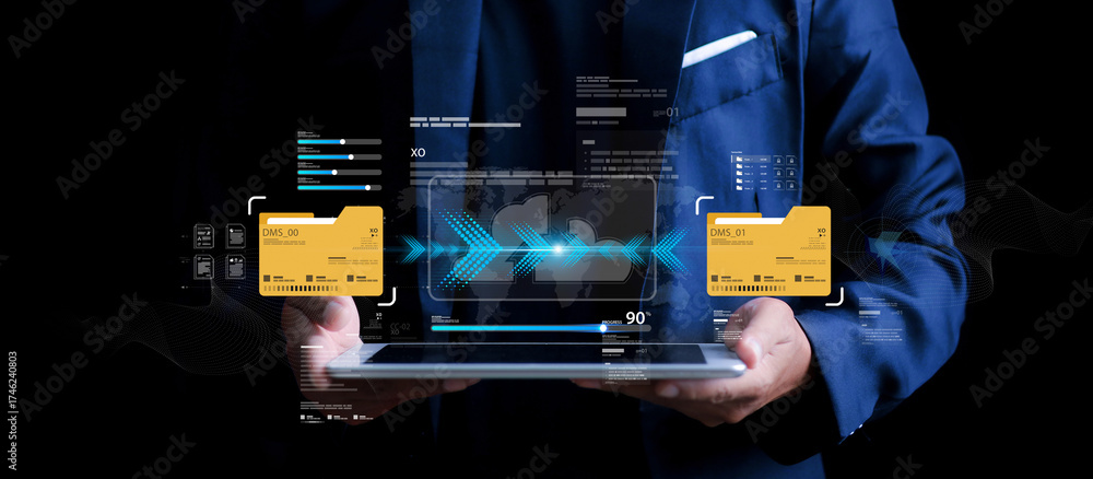 Businessman using digital tablet to manage and transfer files via cloud system. Document management system (DMS) concept for digital data sharing and cloud backup.