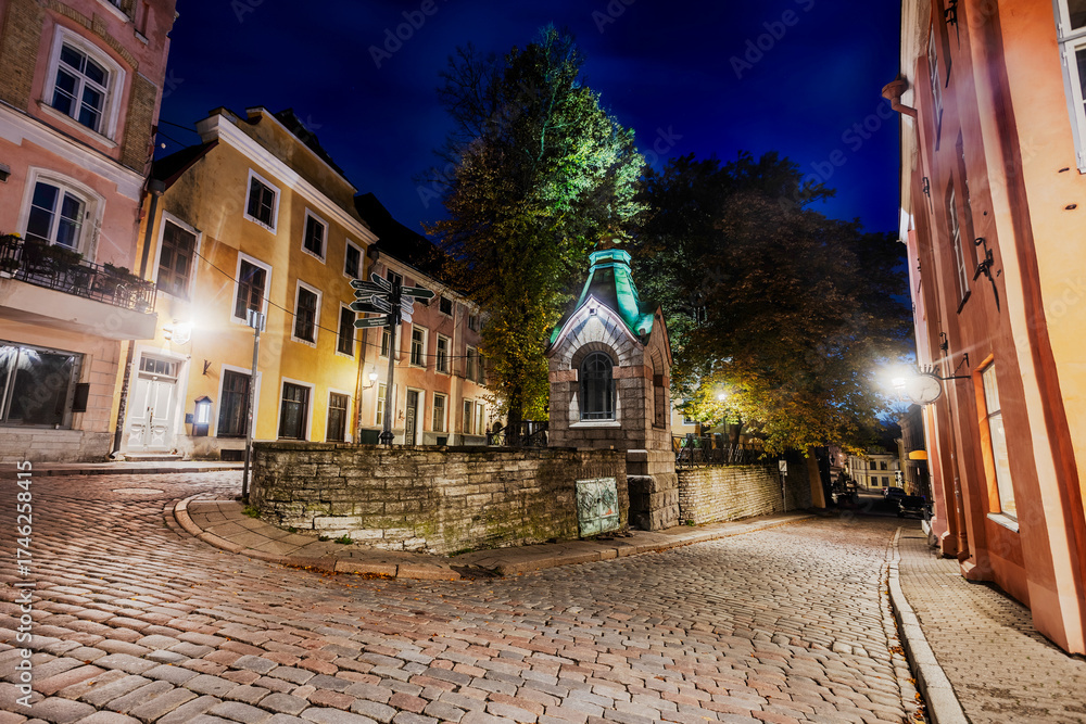 Tallinn Old Town cobblestone street with historic buildings and Tiny chapel at night