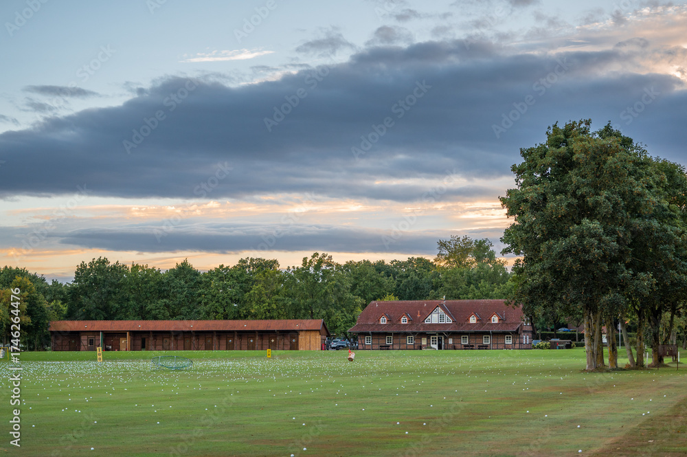 Golf driving range at sunset with clubhouse and practice area