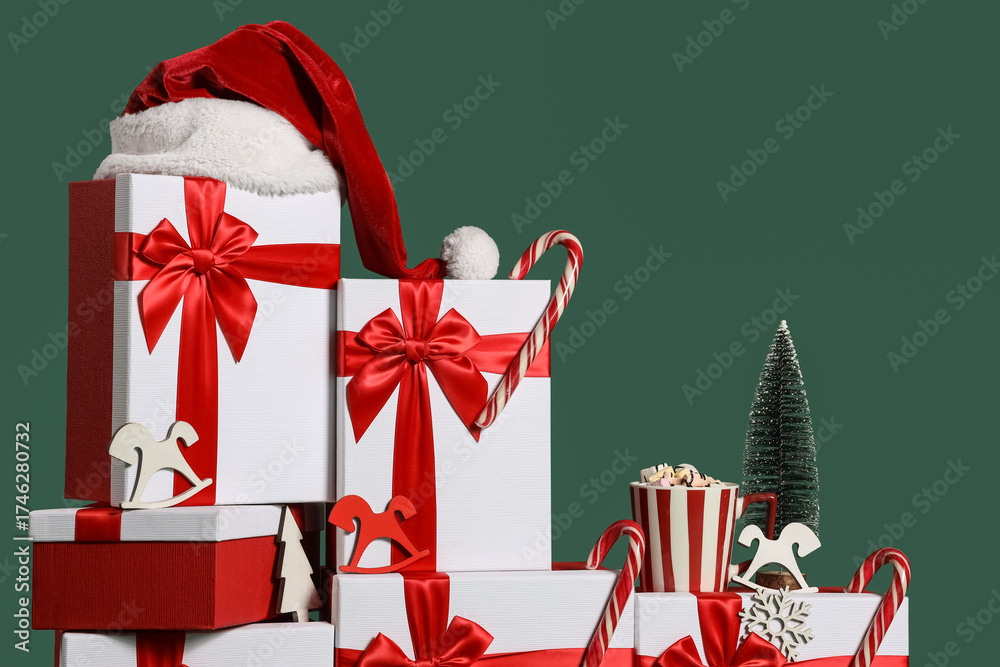 Beautiful gift boxes with candy canes, Christmas decorations, cup of cacao and Santa hat on green background, closeup