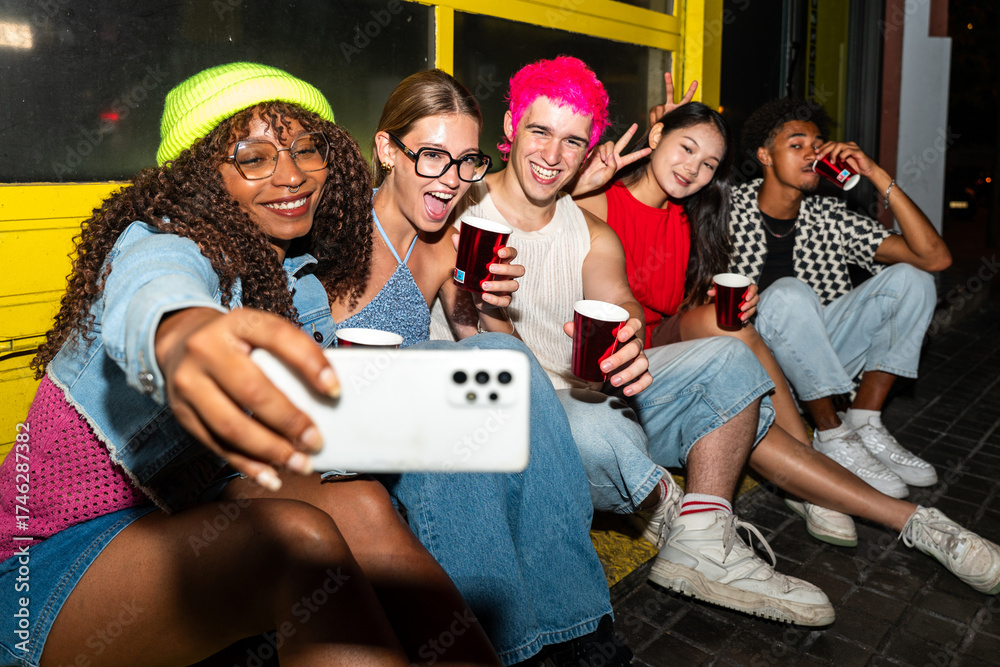 Multiethnic group of young friends having fun on the streets in the night - Stylish cool multiracial people wearing stylish clothing hanging out before party in a disco club