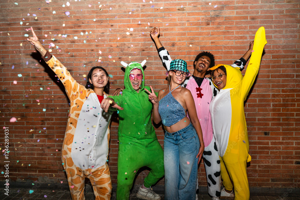 Multiethnic group of young friends having fun on the streets in the night - Stylish cool multiracial people wearing stylish clothing hanging out before party in a disco club