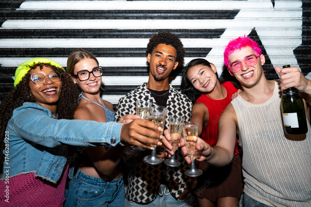 Multiethnic group of young friends having fun on the streets in the night - Stylish cool multiracial people wearing stylish clothing hanging out before party in a disco club