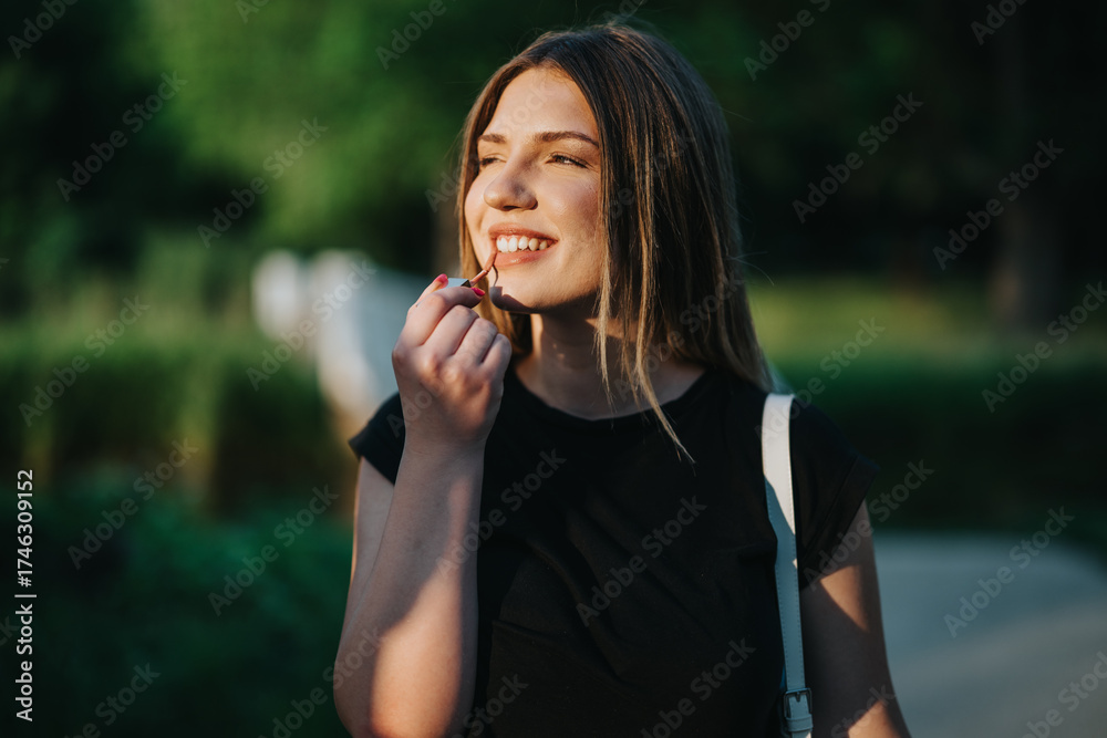 Young woman stands outdoors in a lush park, smiling warmly while applying lipstick. Surrounded by greenery and bathed in sunlight, she embodies confidence and positivity in a serene environment.