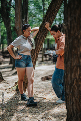 Two friends share a relaxed moment in a sunlit forest, leaning on a tree and talking. They wear casual summer outfits, highlighting outdoor lifestyle, friendship, and exploration in nature.