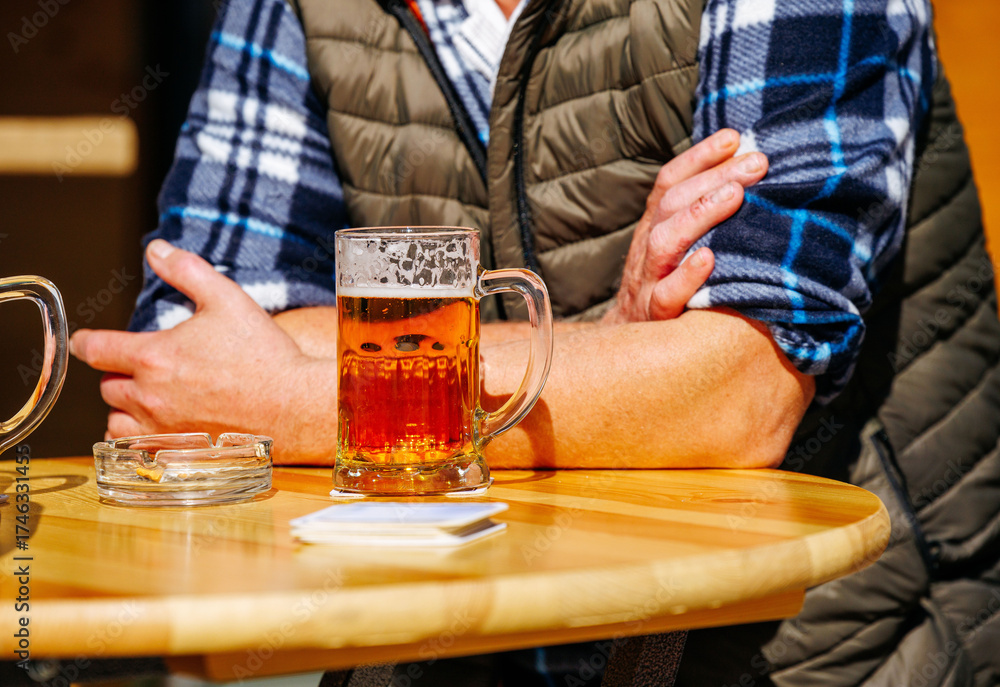 Caucasian male enjoying beer outdoors at a wooden table