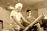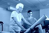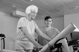 Elderly Caucasian woman walking on treadmill under control of nursing assistant while getting through physical therapy in rehab hospital