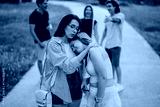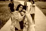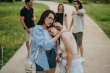 A close moment of emotional support and friendship while others interact joyfully in the background.
