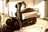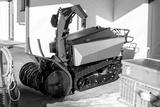 Tracked snowblower stands near building on sunny winter day. Bright red metal machine designed for powerful snow removal and efficient outdoor maintenance in alpine or cold environments