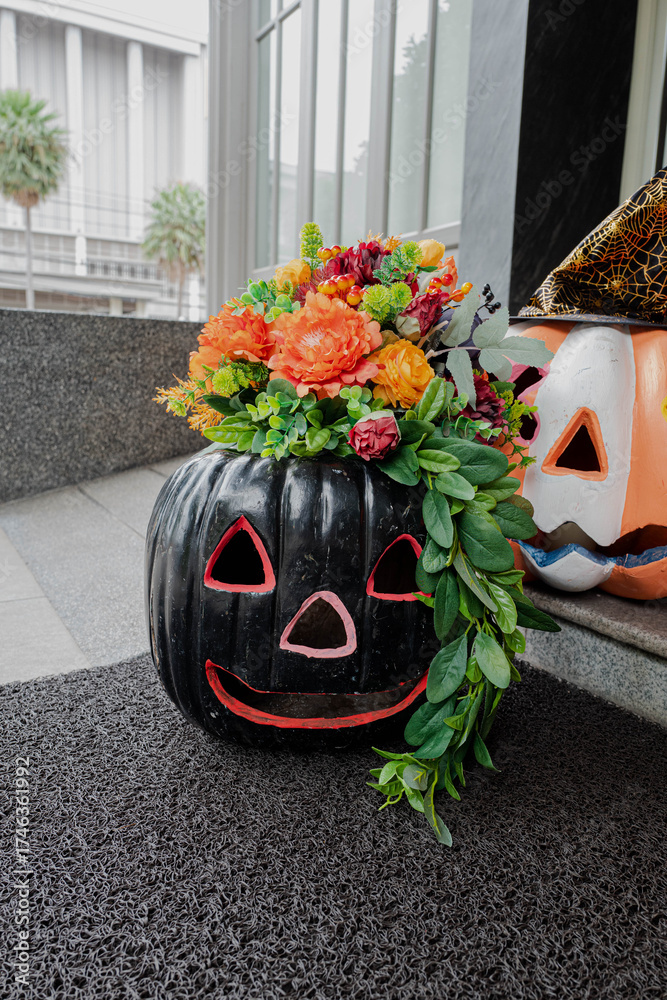 A festive Halloween pumpkin decoration filled with flowers. The pumpkin is smiling with bright flowers and foliage, adding a touch of autumnal charm