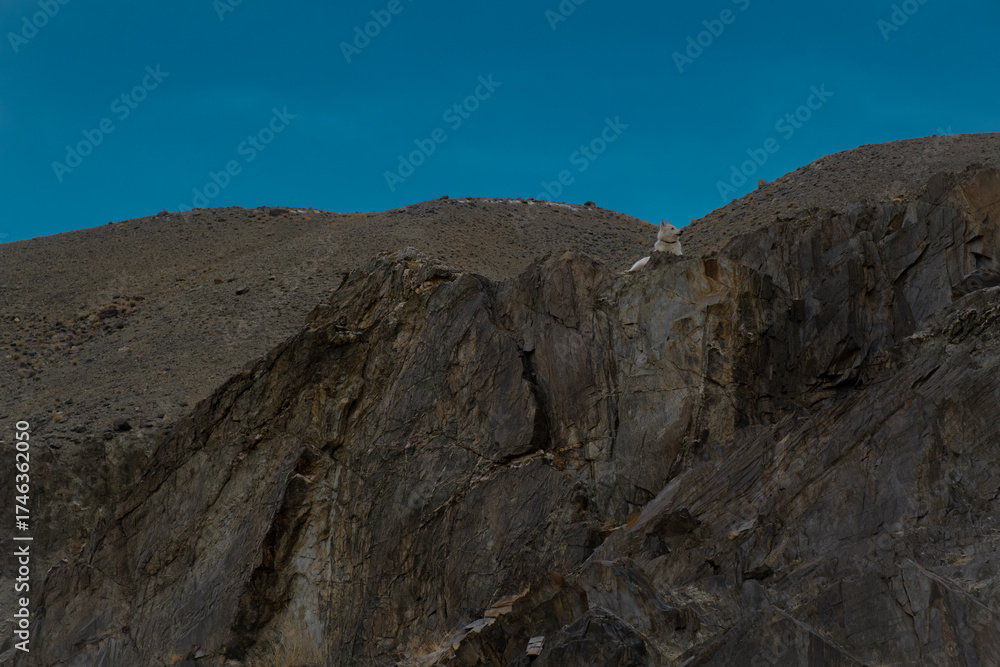 A white dog is sitting on top of a mountain and smiling, with a blue sky in the background. A four-legged friend of man on the mountain looks down.
