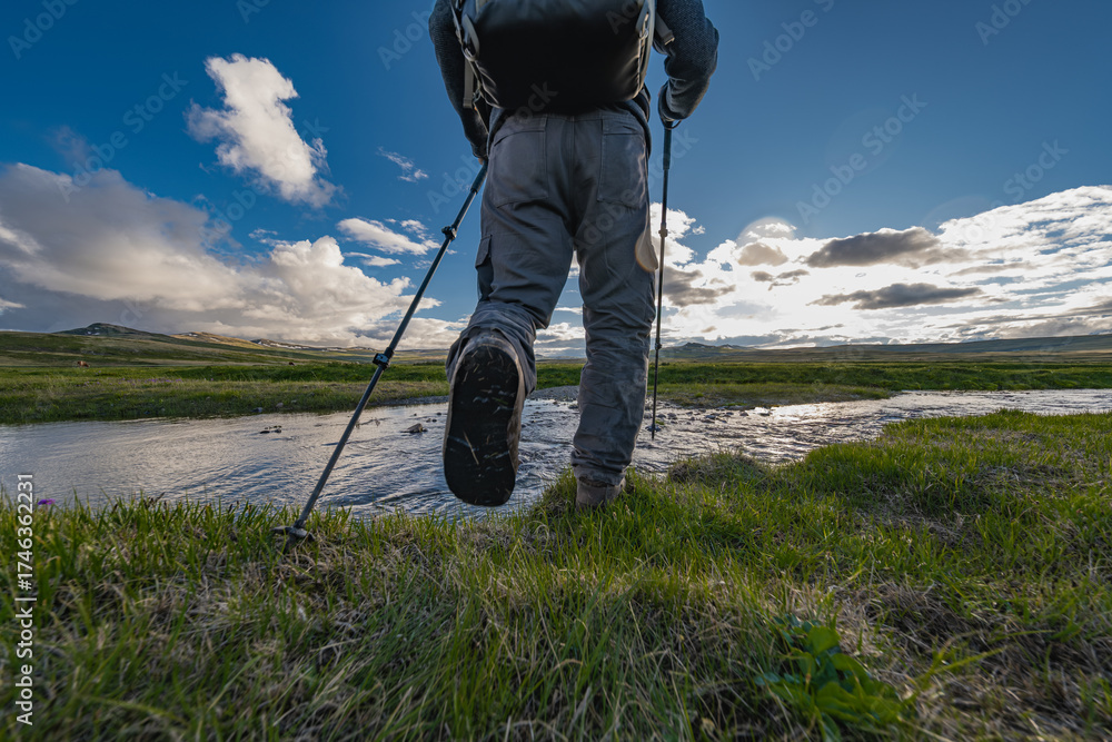 A traveler with a backpack on his back and trekking poles in his hands is walking through a green meadow with a river in front of him. Travel boots.