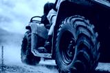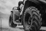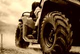 Close-up of a rugged all-terrain vehicle driving through dirt on a dusty trail, capturing the thrill of off-road adventure and the power of outdoor exploration.