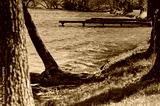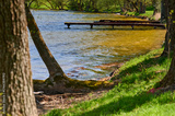 Leaning tree by clean lake water, Masuria shoreline detail, spring color, horizontal, natural light, eco theme and lifestyle blog header
