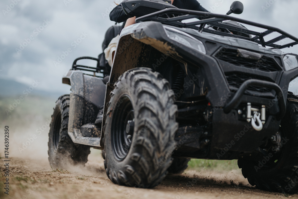 An all-terrain vehicle cruising on a dirt path, showcasing adventure and outdoor exploration in a rugged landscape amidst a natural setting.