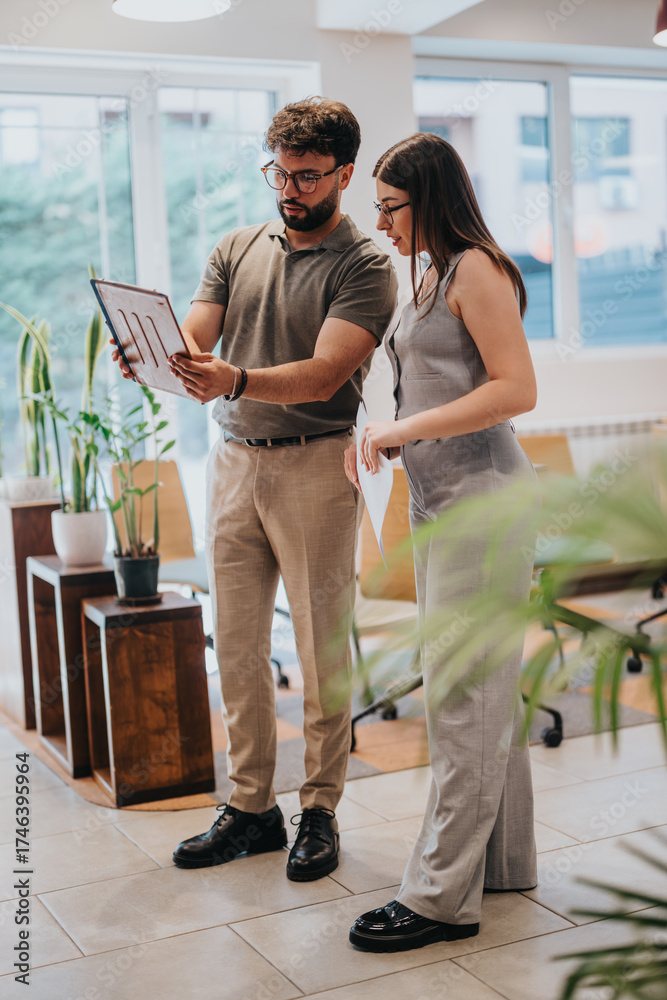 Two young professionals stand in an office, reviewing data on a tablet together. The environment features modern decor and natural light, suggesting a collaborative and productive work setting.