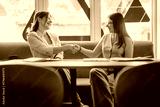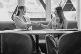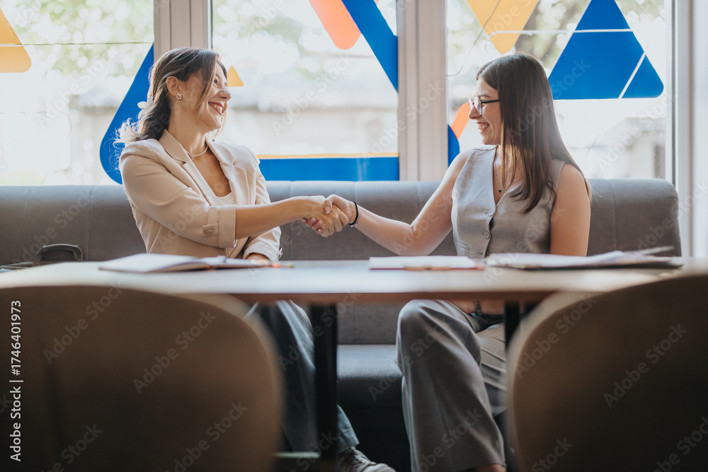 Two women seated at a table inside a modern setting, engaging in a handshake while smiling, conveying friendliness and collaboration.