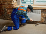 Technician installing white electric convector heater on brick wall indoors. Concept of energy efficiency, utility services, and winter comfort for residential heating materials and media use.