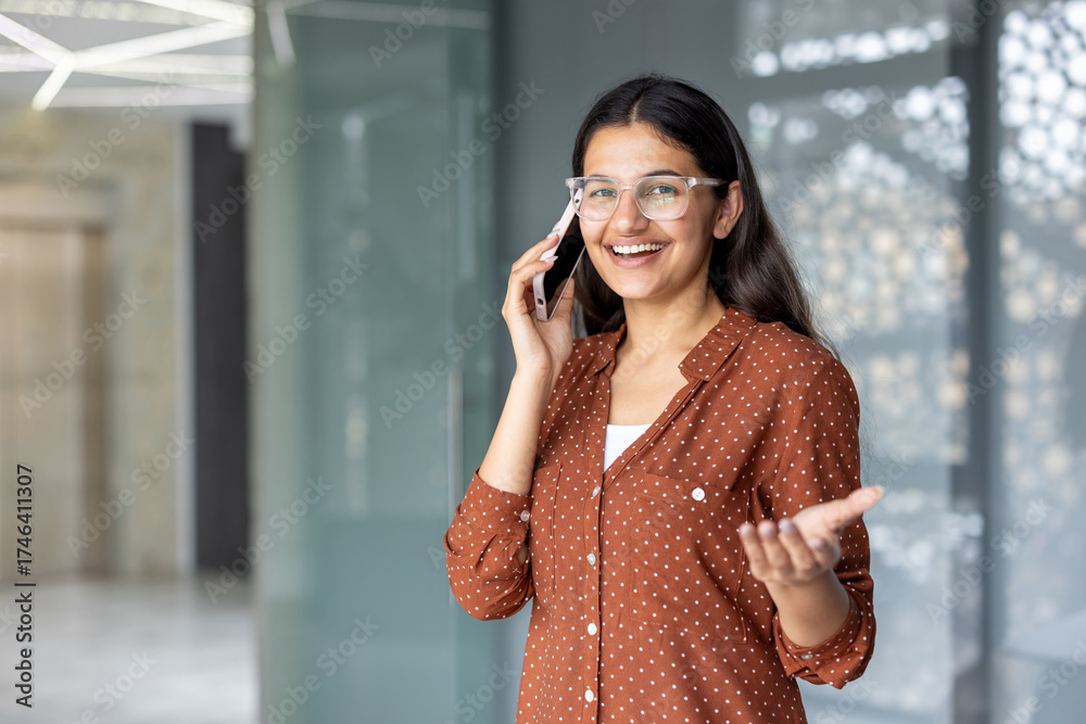 Young indian professional woman in eyeglasses stands in a modern office, smiling and animated while talking on her smartphone, conveying confident, friendly business conversation