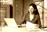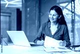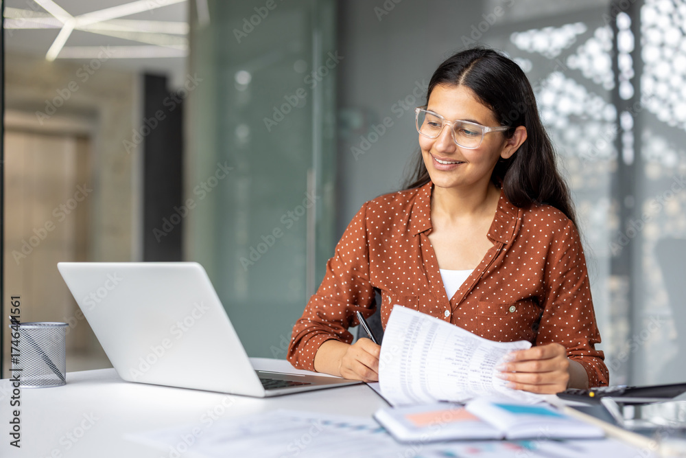 Indian businesswoman smiling, wearing glasses, analyzing financial documents and using a laptop while sitting at a desk in a contemporary office setting