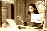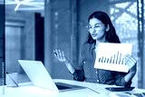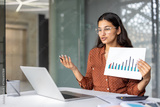 Young businesswoman leading a remote video meeting from a modern office, presenting laptop data and a bar chart while explaining strategy and smiling confidently into the camera