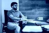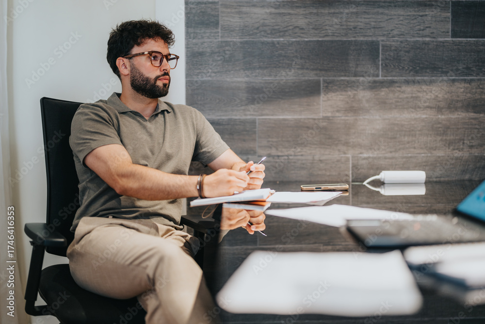 A well-dressed man sits at a desk holding a pen, surrounded by papers and devices, appearing thoughtful. The setting reflects a modern and professional workspace environment.