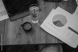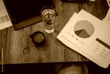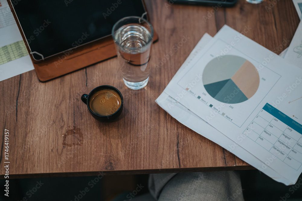 Business workspace depicting documents with charts, a cup of coffee, and a tablet on a wooden desk.