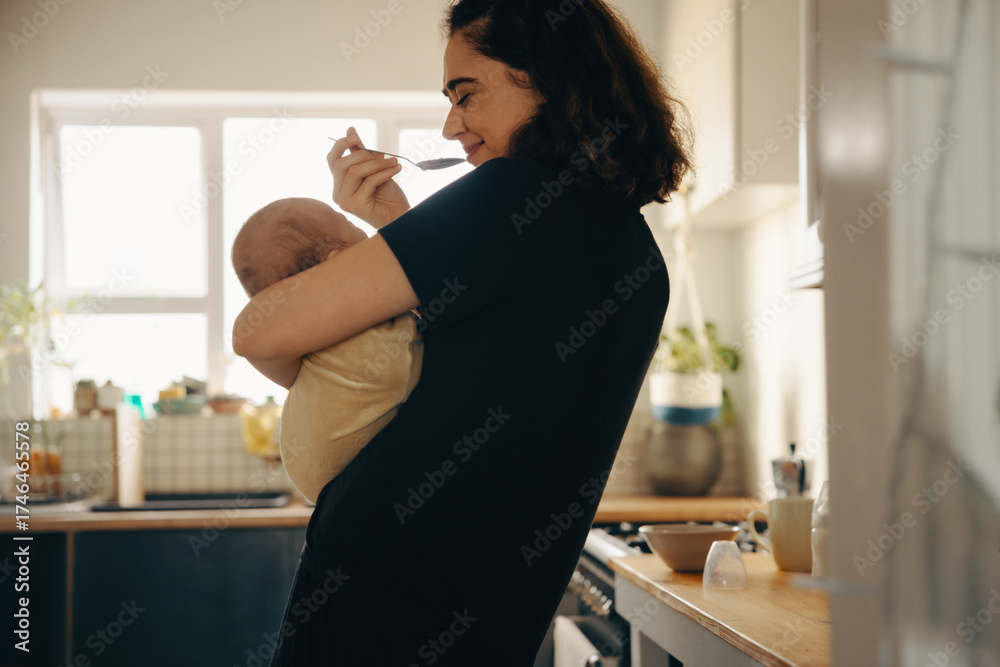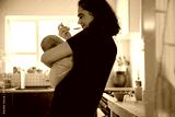 Mother holding baby and eating