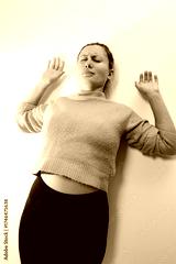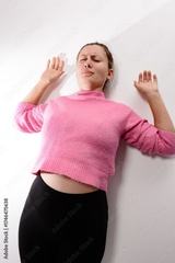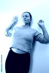 Woman in pink top and black leggings leans against white wall with eyes closed and pained expression.