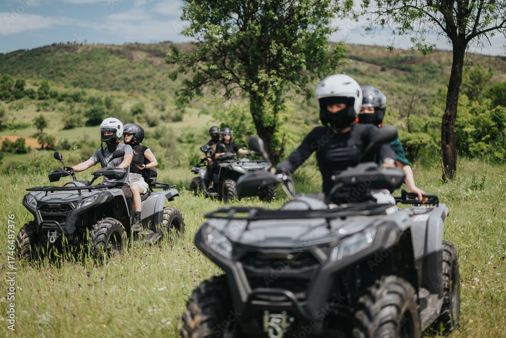 A group of friends riding quad bikes through green fields surrounded by trees and hills, enjoying an adventurous outdoor activity in a picturesque, sunny location promoting friendship and excitement.