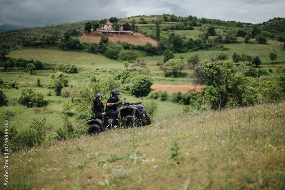 Two friends ride quad bikes through verdant countryside, highlighting adventure, nature, and outdoor activity.