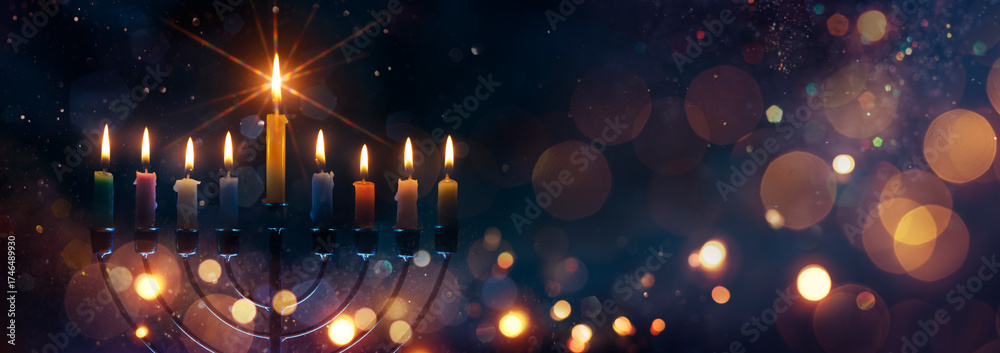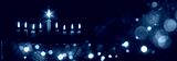 Hanukkah Menorah - Burning Candles In Dark With Glittering And Abstract Defocused Lights - Low Key