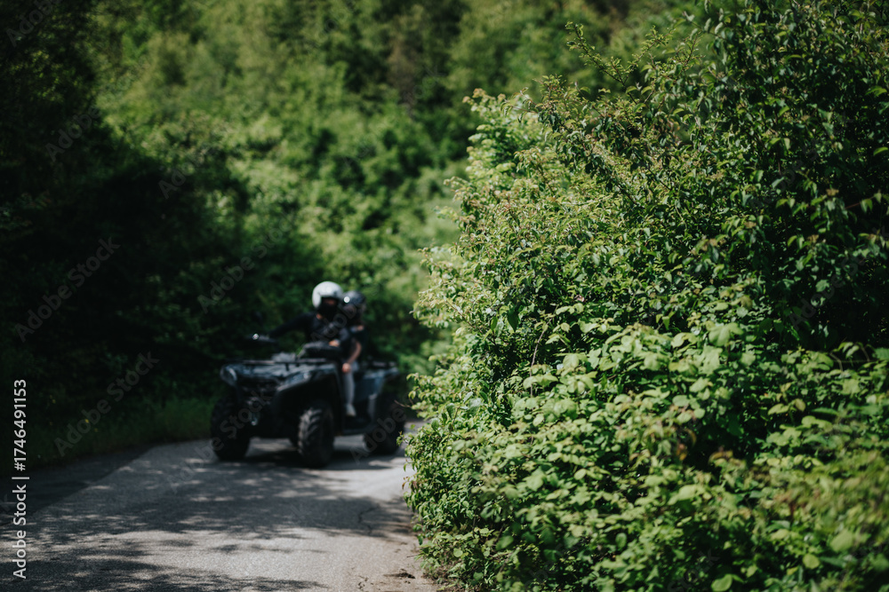 Two individuals wearing helmets riding a quad bike along a scenic forest pathway, emphasizing adventure, friendship, and connection with nature amidst a lush green environment.