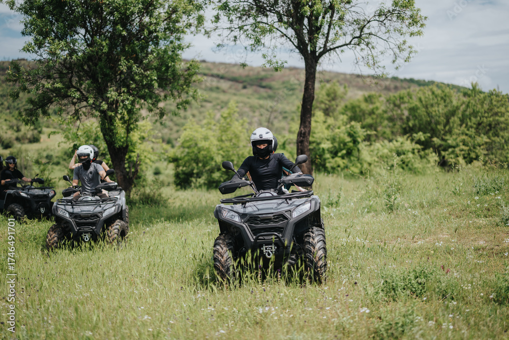 Three friends enjoy a thrilling quad biking adventure through a verdant landscape on a sunny day.
