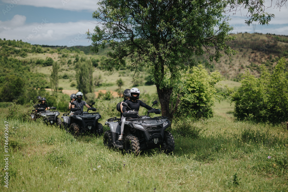 Friends embark on an exciting quad bike adventure, navigating a picturesque green landscape with trees.