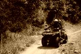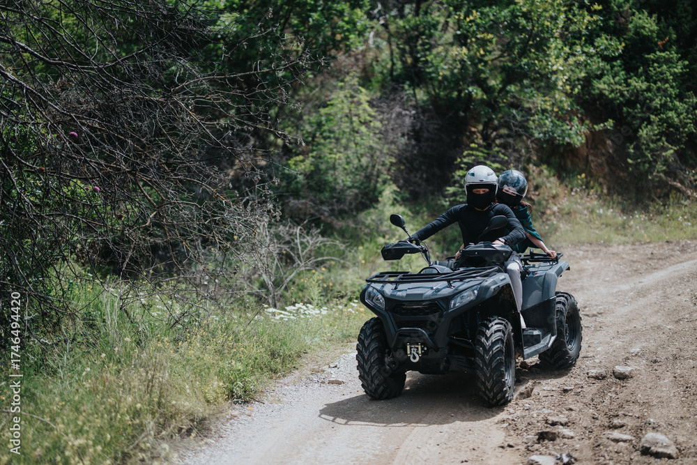 Two individuals ride a quad bike along a rough trail in a lush forested area. Both are geared up with helmets, adding a sense of outdoor adventure and fun in a natural setting.