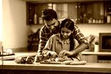 Indian father and daughter chopping cucumber, sharing joyful bonding at home