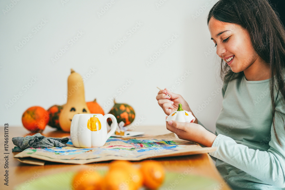 Female kid painting a pumpkin on a cup for an halloween party fest - Holidays and art concept - Main focus on face