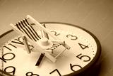 Red beach chair and hat on red clock with blue background. Annual leave travel period for relaxation, time to travel concept. Period of paid time off (PTO) granted to employees by their employer.