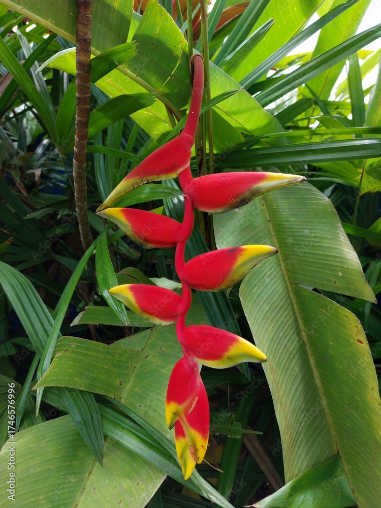 Close-up of Heliconia rostrata, also known as hanging lobster claw or false bird of paradise, with bright red and yellow bracts surrounded by lush tropical green leaves in natural sunlight.
