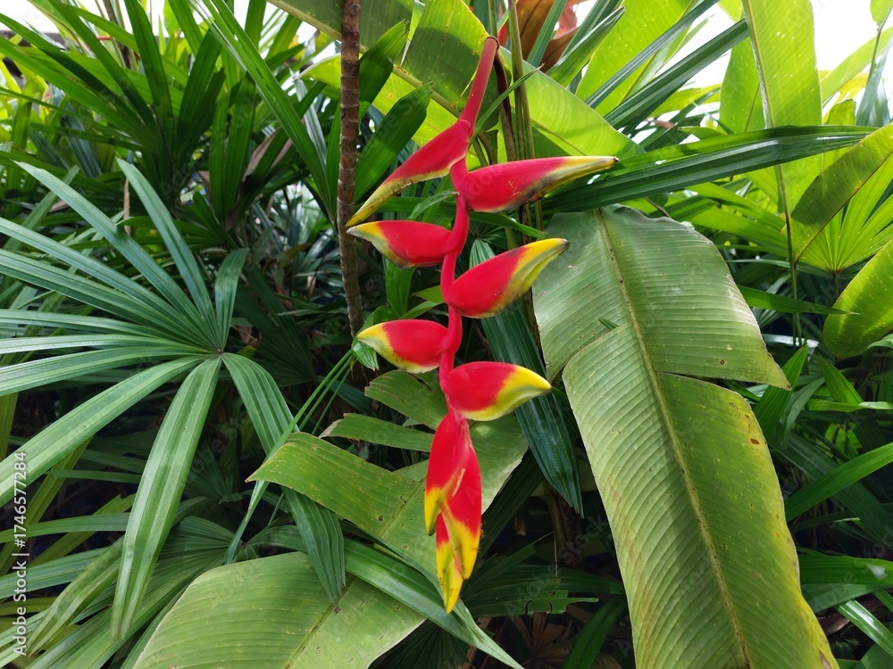 Close-up of Heliconia rostrata, also known as hanging lobster claw or false bird of paradise, with bright red and yellow bracts surrounded by lush tropical green leaves in natural sunlight.