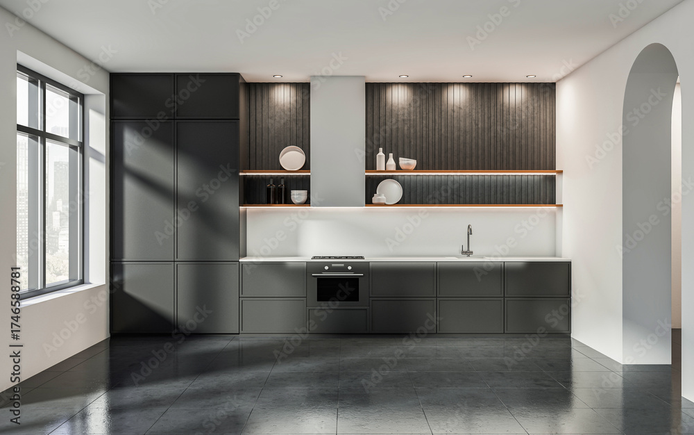 Contemporary kitchen interior with minimalist design, matte cabinetry, and decorative shelving, set against a bright modern home background. 3D Rendering
