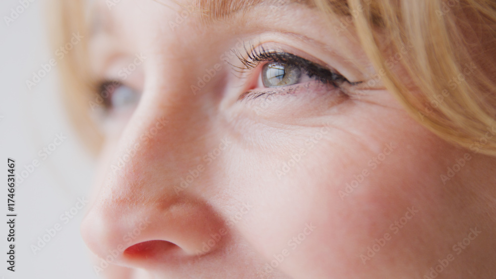 Close Up Studio Shot Of Woman's Eye Against Plain Studio Background