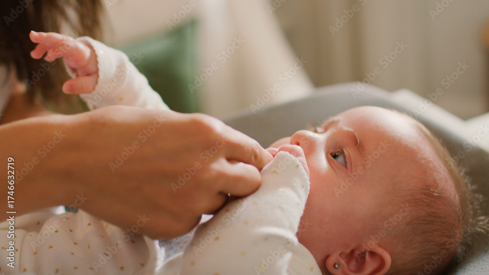 Close Up Of Baby Lying On Changing Mat Holding Mother's Finger At Home