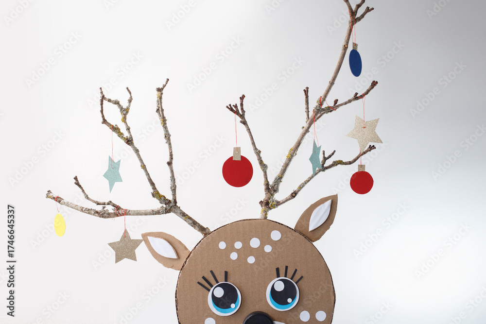 Close-up of cardboard reindeer head with twig antlers decorated with hanging paper stars and round ornaments on white background. DIY handmade Christmas and winter holiday decoration concept
