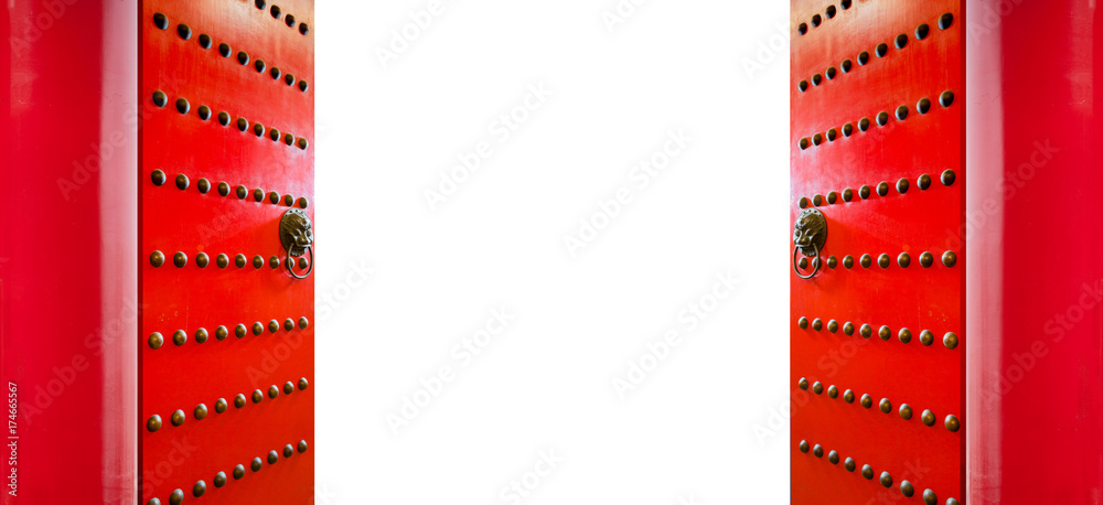 Grand Chinese Doors Temple Entrance Opening with empty space, include path for replace background. ratio 8:3