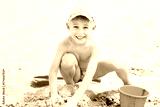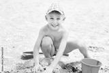Little boy is playing with sand on the beach. Summer, building castle on the beach,